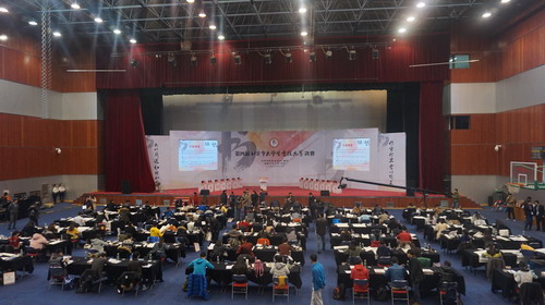 中午12时许,组委会公布了进入知识问答环节的前14位选手名单,我校林剑和张翼同学成功入围。下午13时许,正式进入了知识问答部分,共分为三轮:第一轮必答题,第二轮选手分组必答题,第三轮在前两轮分数累计前提下,由前六名选手分组抢答,争夺特等奖。问答题目涉及书法文化及文史知识。现场角逐气氛紧张,观众不时为选手的精彩表现鼓掌助威。我校两位选手虽遗憾未能进入第三轮,但也赛出了水平,展现了个人风采。为了调节紧张氛围,组委会还穿插了互动竞猜环节,台下观众纷纷热情参与。