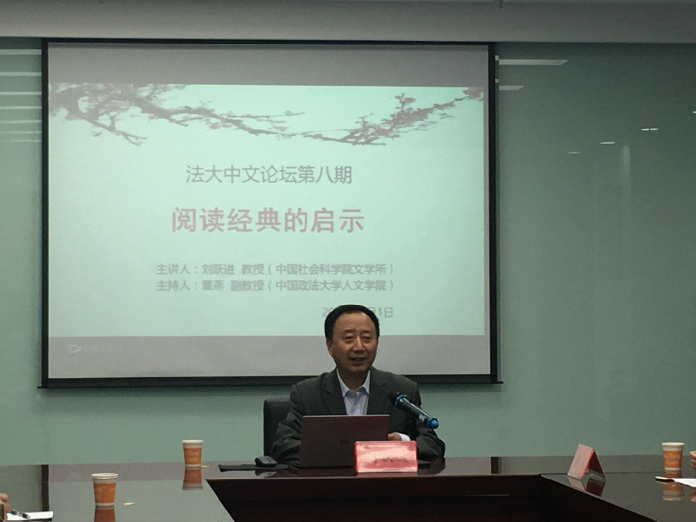 讲座伊始,董燕老师首先对刘跃进教授莅临法大表示了欢迎和感谢,并以“生活不止眼前的苟且,还有诗和远方的田野”引出了刘教授的演讲。刘教授围绕两个问题——“什么是文学”和“什么是经典”娓娓而谈,张弛有度,现场学术氛围浓厚,气氛热烈。