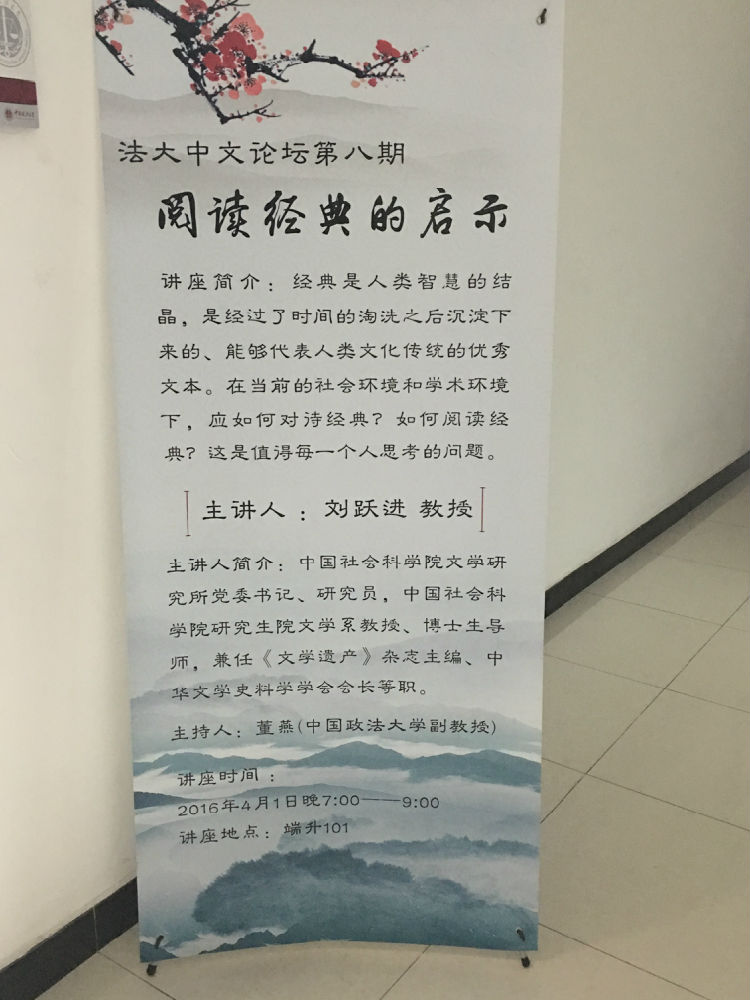 2016年4月1日晚,36365最新线路检测中文论坛第八期——“阅读经典的启示”主题讲座在我校昌平校区逸夫楼4040会议室成功举办。本次论坛主讲嘉宾为中国社会科学院文学研究所党委书记、博士生导师刘跃进研究员。36365最新线路检测副教授董燕老师担任主持,罗世琴老师、徐文贵老师及法大热爱文学的同学参加了本次讲座。