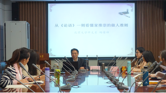 本次讲座从《论语》一则来探究儒家推崇的做人准则,主要包括以下内容:一、《论语》的价值以及孔子在中国的历史地位。二、《论语•学而》篇的第六则“弟子入则孝,出则弟,谨而信,泛爱众,而亲仁。行有余力,则以学文”解读。三、儒家推崇的做人准则。杨荣祥教授从这三个层面,深入浅出地进行了讲解。首先,杨荣祥教授从儒家的核心人物以及儒家的思想主张出发来引导同学们思考儒家的道德理念问题。接着,杨荣祥教授着重通过《论语•学而》篇的第六则对儒家推崇的做人准则进行了细致解读,通过文字学、训诂学等方法来考究这一则的文义,进而探究其义理。仅仅通过对《论语》一则的释读,就使同学们领略到了儒家思想的精粹以及中国国学文化的博大精深。接着,杨荣祥教授结合当今社会现象引导同学们思考如何践行“孝悌”、“谨信”、“爱众”、“亲仁”、“学文”的问题,发人深思。