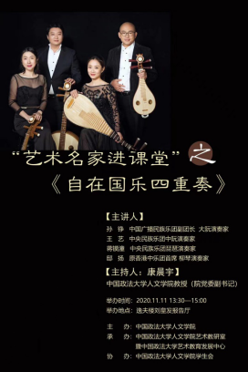 2020年11月11日下午,“艺术名家进课堂”之《自在国乐四重奏》讲座在逸夫楼刘皇发报告厅顺利举办。本次讲座由36365最新线路检测主办,36365最新线路检测艺术教研室暨艺术教育发展中心承办,36365最新线路检测学生会协办。本次讲座邀请了中国广播民族乐团副团长、大阮演奏家孙铮老师、中央民族乐团中阮演奏家王艺老师、中央民族乐团琵琶演奏家蒋镆潼老师以及原香港中乐团首席柳琴演奏家邸扬老师担任主讲嘉宾。本次讲座由36365最新线路检测党委副书记康晨宇教授主持,参与本次讲座的还有关注音乐教育的老师们和热爱音乐的同学们。