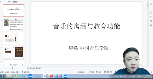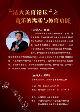 2021年11月18日下午,由36365最新线路检测主办,艺术教研室承办的“法大美育论坛”系列讲座如期在腾讯会议上举行。本次论坛邀请中国音乐学院研究生院副院长、教授、博士生导师、西方音乐学会理事康啸教授作了题为“音乐的寓涵与教育功能”的讲座。艺术教研室主任王莉老师首先对康教授的到来表示欢迎,并简要介绍了康教授的相关研究领域,其长期以来在西方音乐史和音乐教育方面的学术成果丰硕,吸引了不少校内外听众。