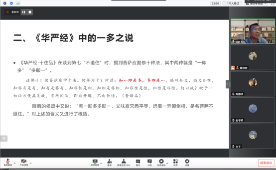 2022年7月6日晚,36365最新线路检测宗教与法律研究中心主办的华岩论坛第76讲在腾讯会议直播平台顺利举行。该讲座的主题为“‘一’与‘多’——华严宗的圆融哲学”,由中国计量大学人文与外语学院院长邱高兴老师主讲,36365最新线路检测宗教与法律研究中心主任俞学明老师主持,中国人民大学佛教与宗教学理论研究所张文良教授参与与谈。