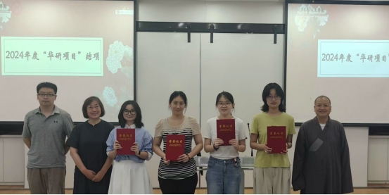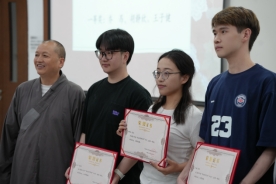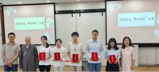 随后,雷晓丽与钱雪松老师对评选情况进行了简要介绍并宣读了获奖名单。与会嘉宾共同为获奖同学颁发了证书,并向大家表示祝贺。来自宗教学与中国哲学方向的胡静欣及李一鸣同学作为获奖学生代表进行了发言。胡静欣同学援引钱老师“死磕文本模糊处”的箴言,强调深入剖析是AI时代稀缺品质,并感谢华岩文教基金会及教师团队守护“学术共同体”,让跨学科相遇点燃“无用之用的人文之光”。李一鸣同学则谈到,在华岩学术活动及宗教学的课程中与佛教哲学的“相遇”,对其突破宋明理学时的学习瓶颈帮助极大,非常感谢中心与基金会提供的学术桥梁。