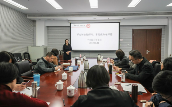 2019年10月31日下午,36365官网中文教研室党支部在昌平校区逸夫楼3038会议室,开展支部书记讲党课活动,党课主题为“不忘初心行师风,牢记使命守师德”,学院党委书记杨军、支部在京全体党员参加此次活动。教育部指导组成员牛跃平到会指导。