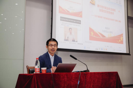 上午,我校马克思主义学院教授、思想政治教育专业博士生导师赵庆杰老师以“遵守党内政治生活准则,加强党员党性修养”为题,系统梳理了《关于新形势下党内政治生活的若干准则》(以下简称《准则》)的核心内涵和主要内容。赵老师强调,办好中国的事情,关键在党,关键在坚持党要管党、全面从严治党。由此出发,赵老师对《准则》进行了深入浅出的讲解,以历史经验和现实故事将“坚定理想信念”、“坚持党的基本路线”等内容要求生动形象地呈现出来,既有理论深度,又有实践温度,引起了全体同志的深刻共鸣。