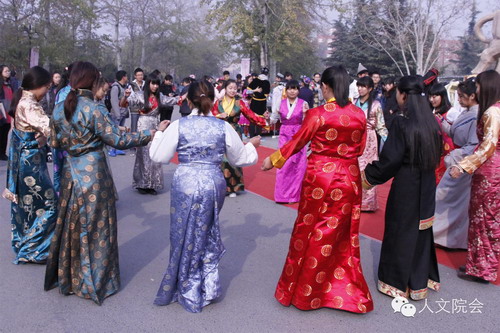 活动首先是由锅庄舞协会的同学们展示了藏族服饰,在短暂的T台式走秀后,身着藏装的同学们围在一起,跳起了锅庄舞,向法大学子们展现了来自雪域高原的热情。锅庄舞在藏语中意为圆圈歌舞,是藏族三大民间舞蹈之一,整个舞蹈由先慢后快的两段舞组成。舞者手臂以撩、甩、晃为主变换舞姿,队形按顺时针行进。