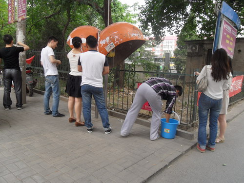 宣传部负责人组织参与人员于早上九点钟在学院路校区新一号楼楼下广场集合,强调了安全事宜之后到达蓟门桥西公交站开始清理工作,本次活动的范围主要包括学校周边街道的公交站台、电话亭、电线杆等小广告重灾区。同学们对周边海报张贴栏、电线杆、围墙、垃圾桶等地方的广告进行了一一清理,他们自动分成几个小组,分工协作,有的负责提水,有的负责用湿抹布擦拭,还有负责拿铲子、垃圾袋,就像一支支清洁队,十分专业,遇到张贴比较牢固的广告也能做到随心应手。同学们在炎炎烈日下干的热火朝天,汗流浃背,仍然不喊一个累字,看到有小广告的地方争相冲上前去将它们清除掉。经过两个多小时的辛勤付出,绝大部分广告被清除了,同学们的所到之处又展现了新的城市面貌。